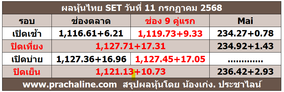ค้าง 1,123.97+13.57 Mai 234.48+0.99