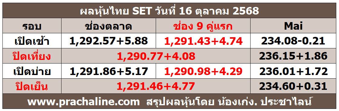 ปิดเย็น 1,291.46+4.77 Mai 234.60+0.31