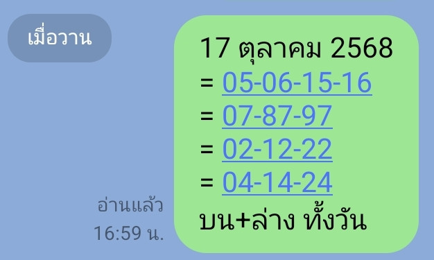 อ้างจาก: แพนด้า. เมื่อ 17 ต.ค 2025, 08:17ชุดทั้งวัน ตั้งแต่วาง ไม่เคยถูกเลย ลุ้นระวังกันด้วย