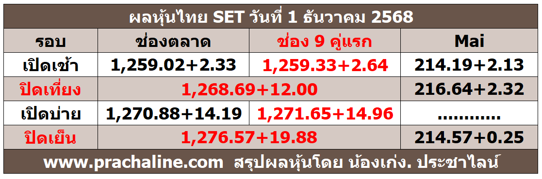ปิดเย็น 1276.57+19.88 Mai 214.57+0.25