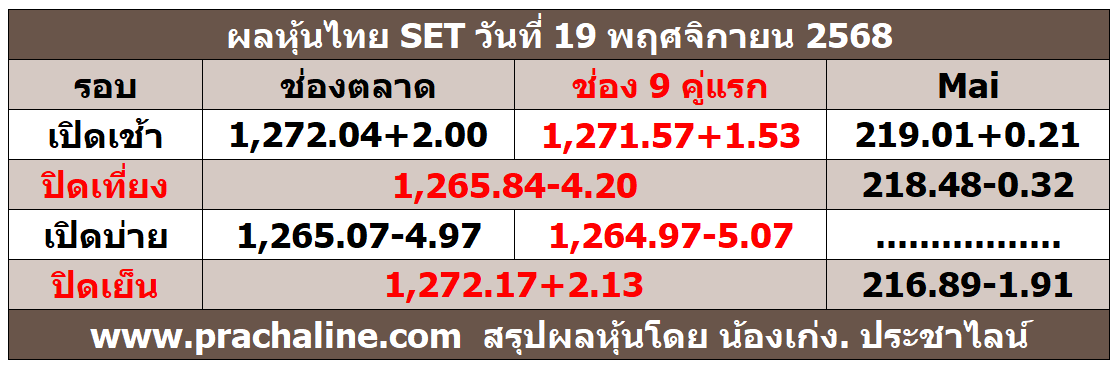 ปิดเย็น 1272.17+2.13 Mai 216.89-1.91