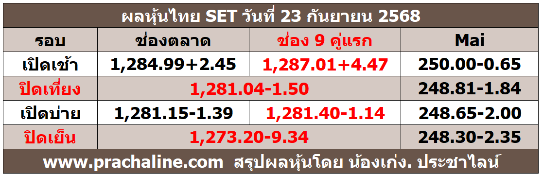 หัวข้อ: เชิญวิเคราะห์ หุ้นไทย SET เปิด-ปิดตลาด ดูผลหุ้นไทย วันที่ 24 กันยายน 68 (อ่าน 13,897 ครั้ง)