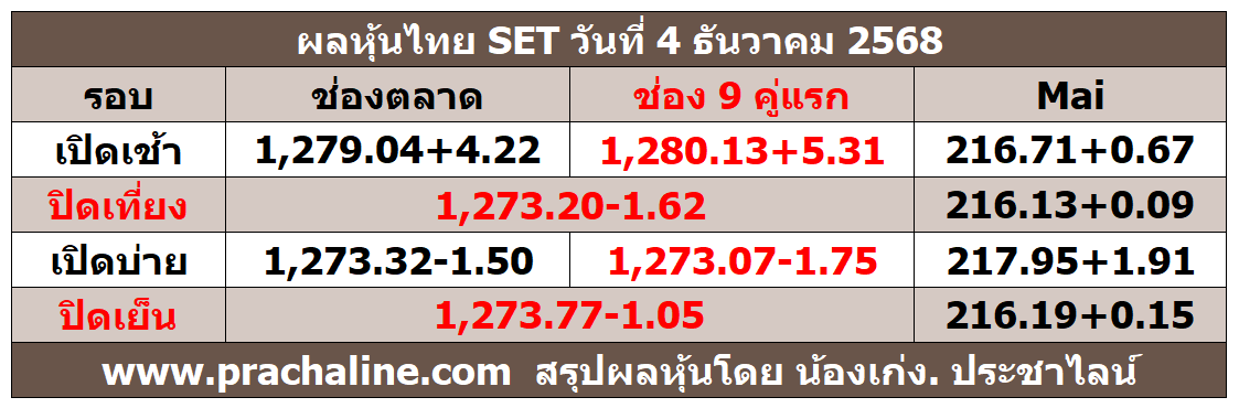ปิดเย็น 1273.77-1.05 Mai 216.19+0.15